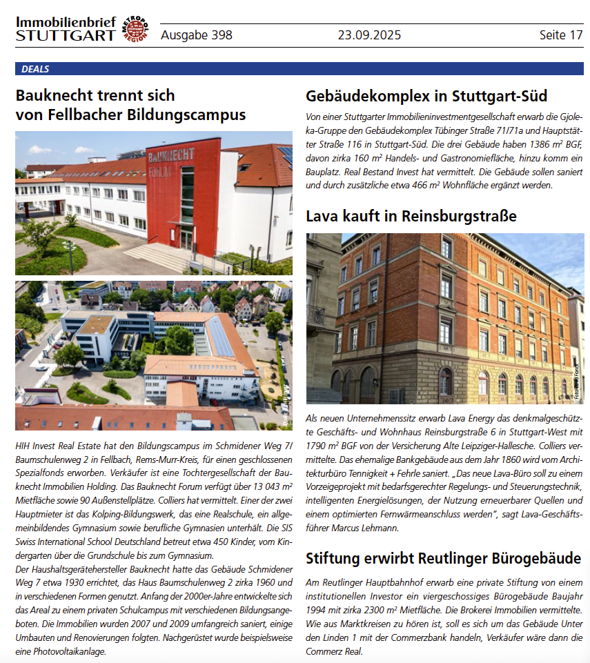 HIH Invest Real Estate hat den Bildungscampus im Schmidener Weg 7/Baumschulenweg 2 in Fellbach, Rems-Murr-Kreis, für einen geschlossenen Spezialfonds erworben. Verkäufer ist eine Tochtergesellschaft der Bauknecht Immobilien Holding. Das Bauknecht Forum verfügt über 13.043 Quadratmeter Mietfläche sowie 90 Außenstellplätze. Colliers hat vermittelt. Einer der zwei Hauptmieter ist das Kolping-Bildungswerk, das eine Realschule, ein allgemeinbildendes Gymnasium sowie berufliche Gymnasien unterhält. Die SIS Swiss International School Deutschland betreut etwa 450 Kinder, vom Kindergarten über die Grundschule bis zum Gymnasium. Der Haushaltsgerätehersteller Bauknecht hatte das Gebäude Schmidener Weg 7 etwa 1930 errichtet, das Haus Baumschulenweg 2 zirka 1960 und in verschiedenen Formen genutzt. Anfang der 2000er-Jahre entwickelte sich das Areal zu einem privaten Schulcampus mit verschiedenen Bildungsangeboten. Die Immobilien wurden 2007 und 2009 umfangreich saniert, einige Umbauten und Renovierungen folgten. Nachgerüstet wurde beispielsweise eine Photovoltaikanlage.